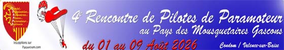 Quatrième rencontre des paramoteurs au pays des mousquetaires gascons, du samedi 1er au dimanche 9 août 2026 sur l'aérodrome de Condom/Valence sur Baïse, entre Adour et Garonne. Comme en 2025, un point de ravitaillement intermédiaire en carburant sera organisé pour celles et ceux qui feront le grand vol jusqu'au Pic du Midi de Bigorre. Le montant de la participation s'élève à 15 euros forfaitaire par pilote et 5 euros par jour de présence. Côté hébergement, l'AUPACV louera des tentes disposant chacune d'un réfrigérateur et de 4 couchages pour 10 euros par nuit et par personne. Clôture des inscriptions en juin.