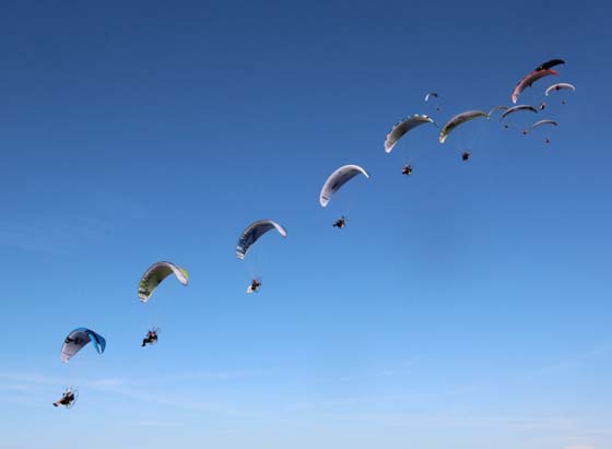 L'équipe de France de paramoteur réalise toujours des exhibitions de grande qualité. Mais pour les vols de démonstration commerciale, c'est dans l'enclos réservé, loin du public.