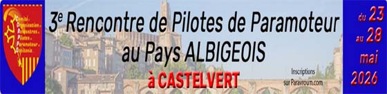 Après le succès de l'édition 2025, c'est à nouveau sur l’aérodrome de Castelvert, dans le Tarn, que se déroulera la troisième Rencontre de pilotes de paramoteur en Pays Albigeois, du samedi 23 au jeudi 28 mai 2026. Le montant de la participation reste à 15 euros forfaitaire par pilote, plus 5 euros par jour de présence. En cas d’annulation du fait du pilote, les sommes perçues resteront acquises à l’association. Il s’agit d’une rencontre qui s'étale sur une durée de sept jours et qui permet de très beaux vols dans tous les azimuts. 30 pilotes maximum par jour. Cloture des inscriptions en mars.