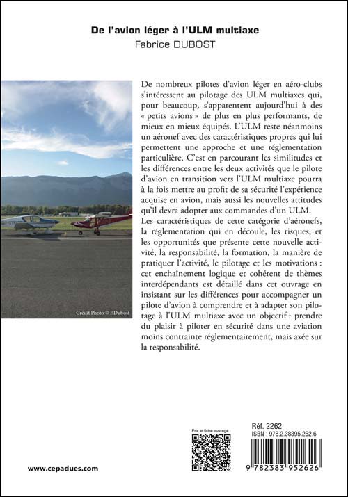 Cépaduès éditions propose un ouvrage écrit par Fabrice Dubost, traitant de l'intérêt et de la migration de nombreux pilotes d'avion léger pour et vers les ULM multiaxes qui, pour beaucoup, s'apparentent aujourd'hui à des ''petits avions'' de plus en plus performants, de mieux en mieux équipés. L'ULM reste néanmoins un aéronef avec des caractéristiques propres qui lui permettent une approche et une réglementation particulière. C'est en parcourant les similitudes et les différences entre les deux activités que le pilote d'avion en transition vers l'ULM multiaxe pourra à la fois mettre au profit de sa sécurité l'expérience acquise en avion, mais aussi les nouvelles attitudes qu'il devra adopter aux commandes d'un ULM.